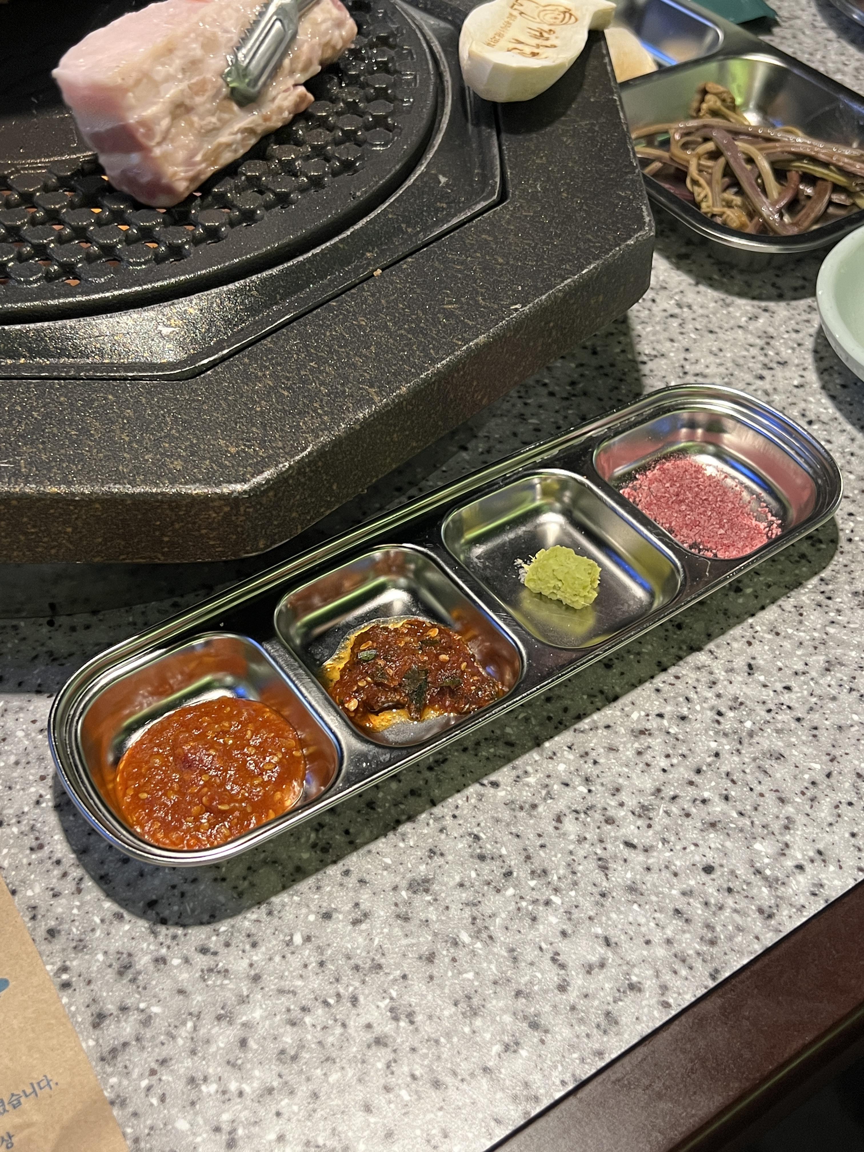 요즘 고기 먹을 때 필수인 고추냉이와, 제줏간만의 특별한 소금, 갈치속젓, 쌈장 이렇게 같이 나오는데