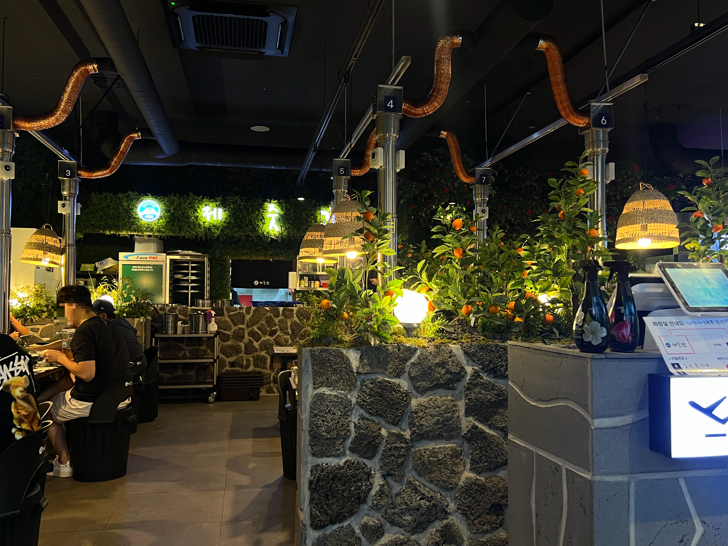 그리고 중간중간 가짜 귤도 볼 수 있었고, 카운터나 조명에도 제주 느낌을 살리기 위해 신경을 많이 쓴 모습입니다.