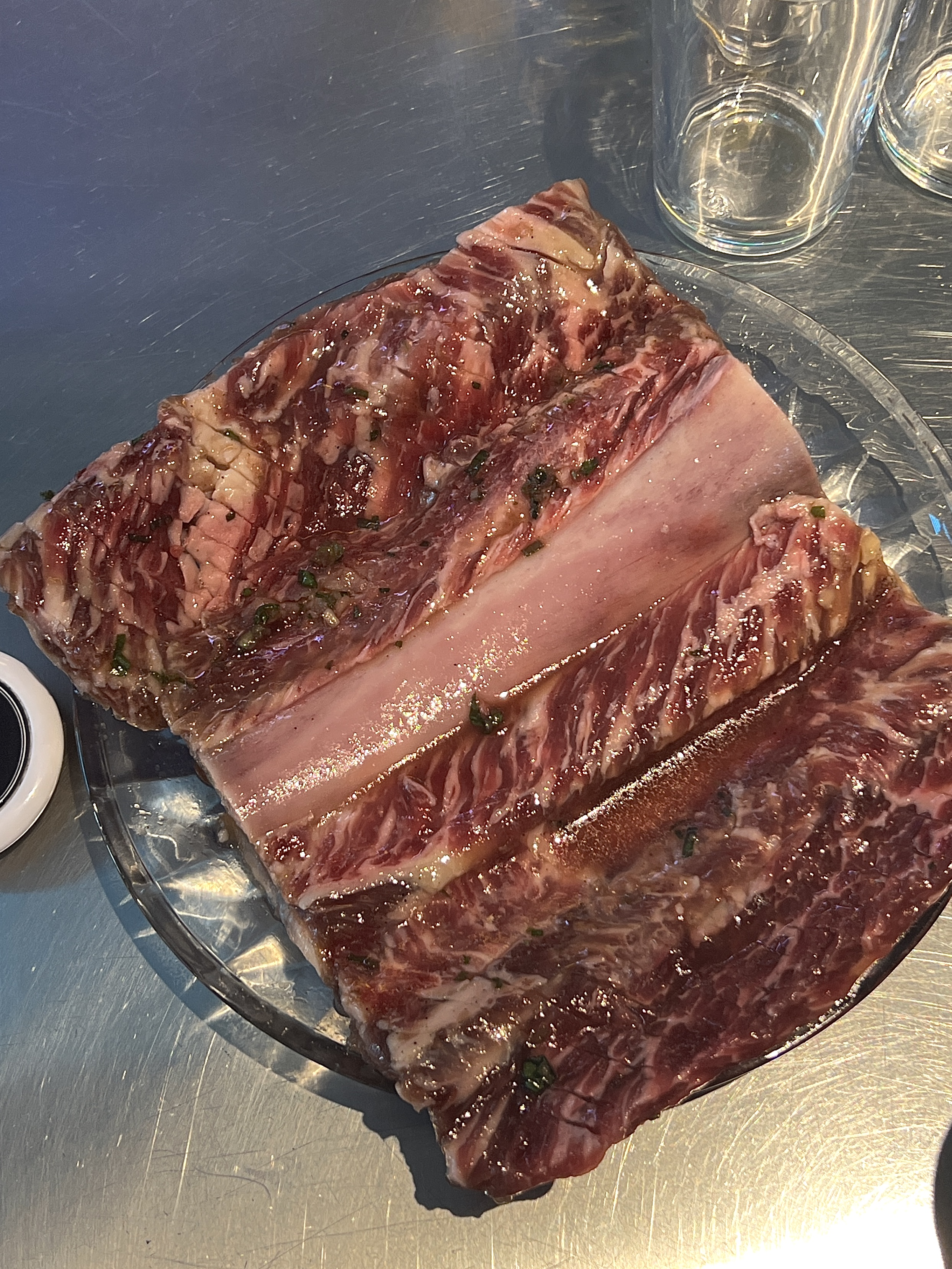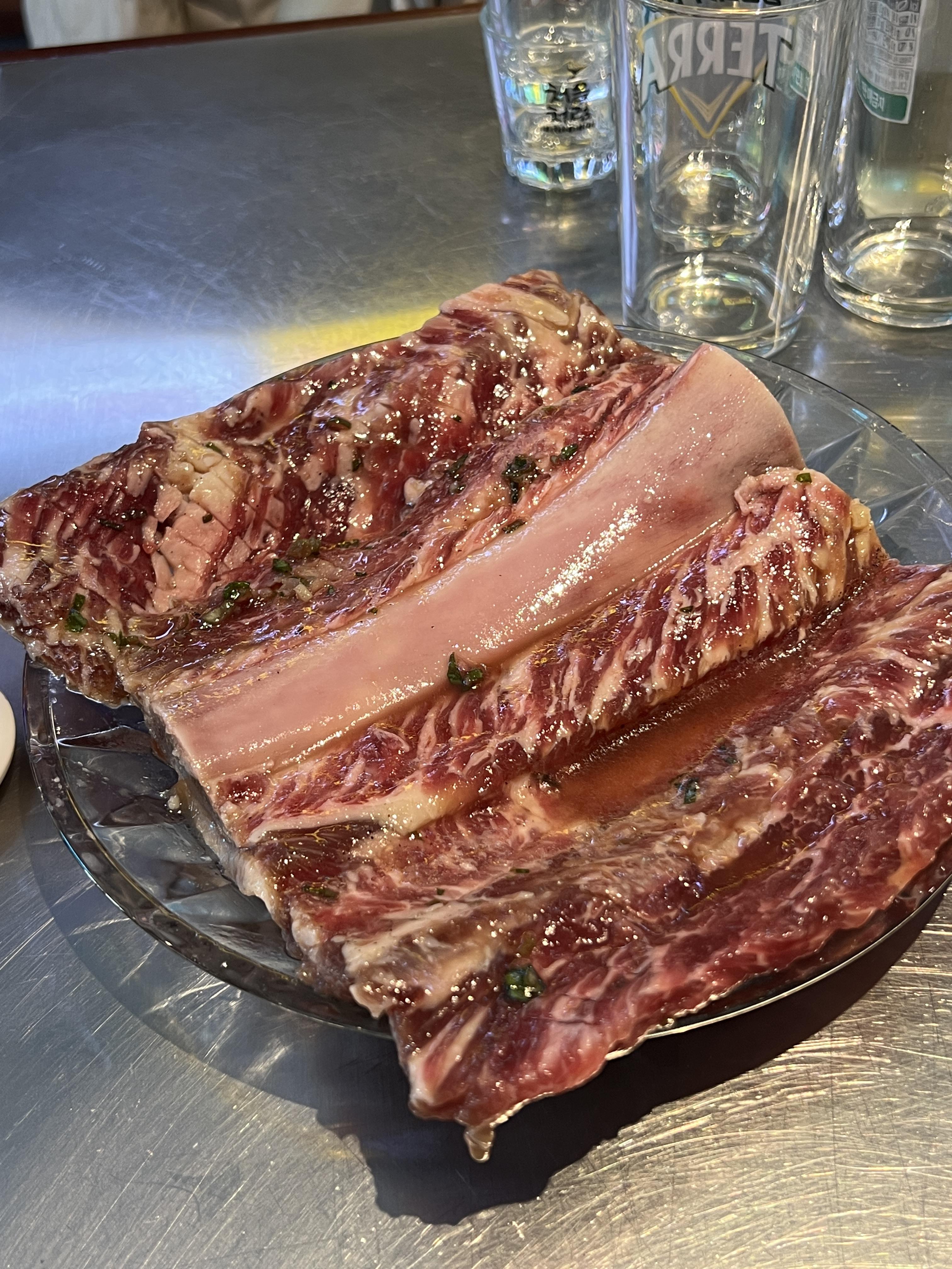 가운데 갈빗대를 중심으로 펼쳐진 고기에는 사선으로 칼집이 들어가 있어 양념이 더욱 잘 스며들어 보이고