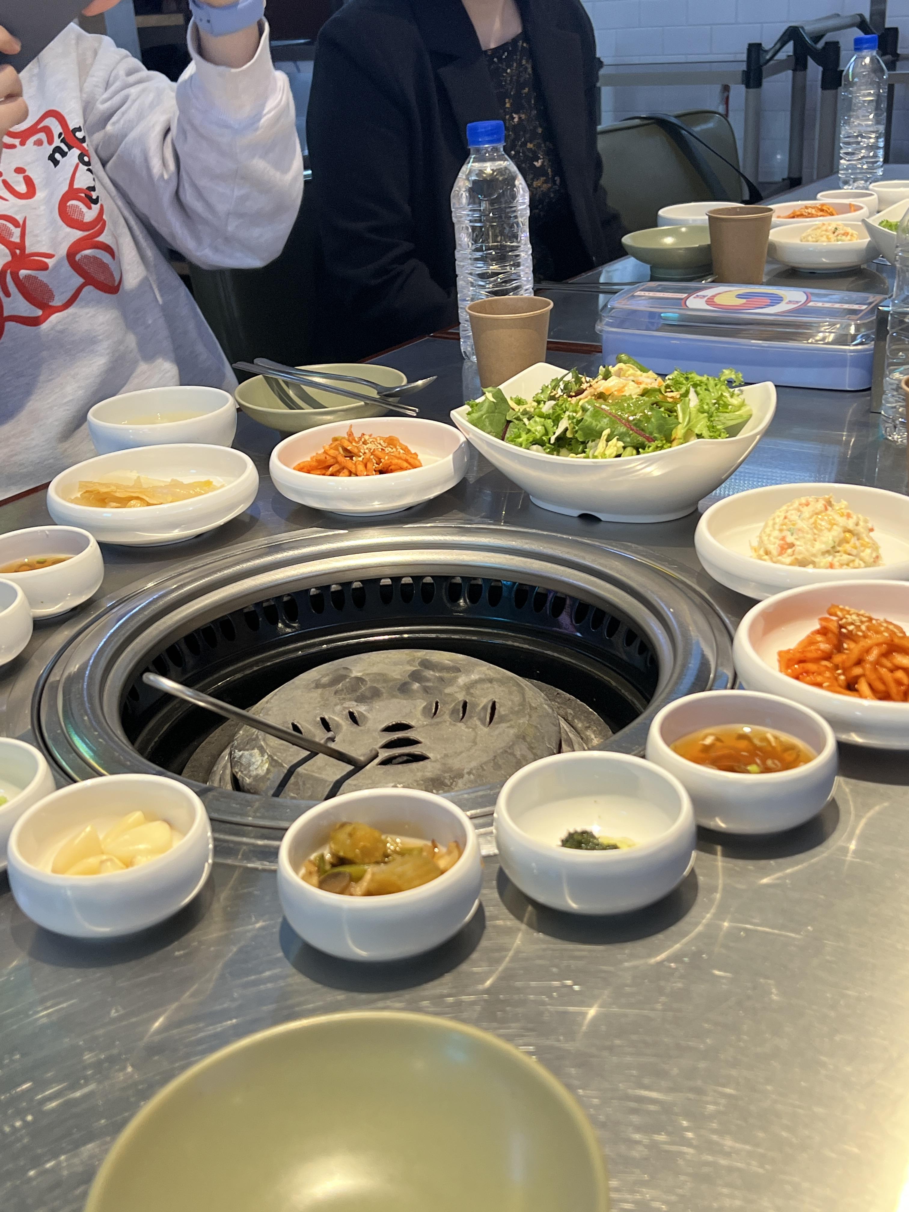 청기와 타운 기본 상차림은 불판을 중심으로 고기와 곁들여 먹을 반찬류와 소스류들을 놔주었습니다.