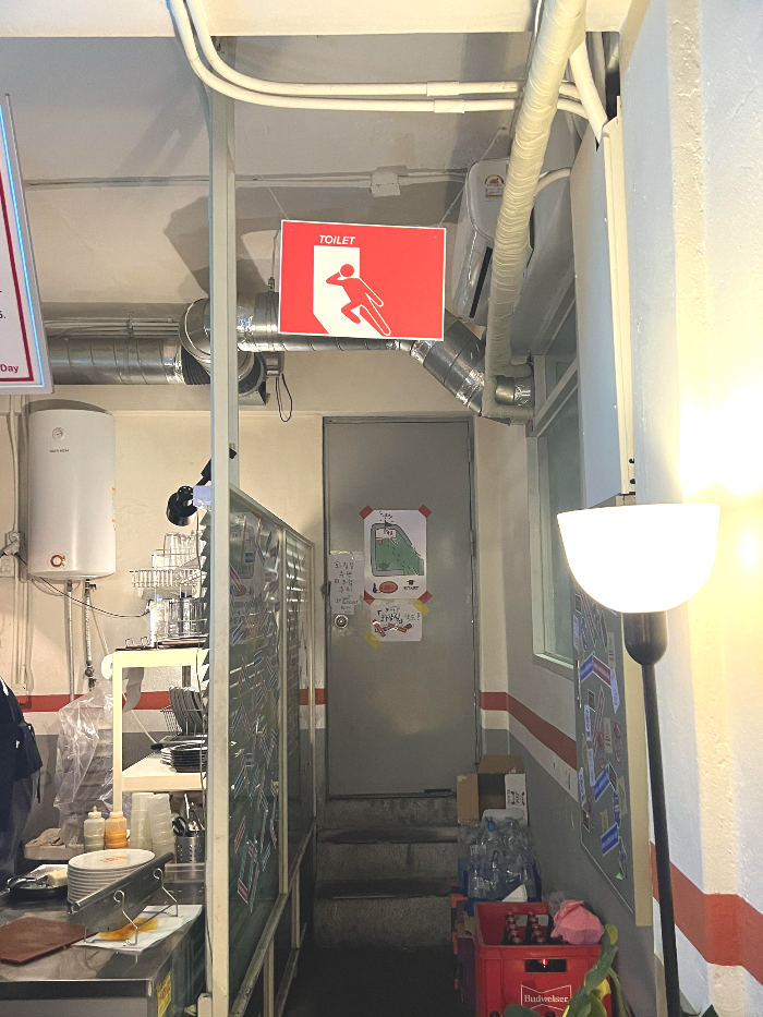 한쪽 구석에 화장실 가는 표시판이 매장과 어울리게 설치되어 있어서 눈에 띄었어요.