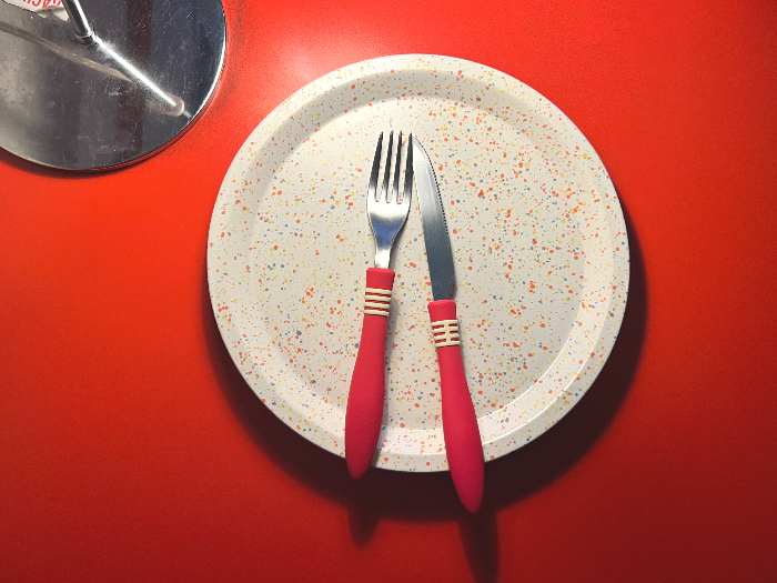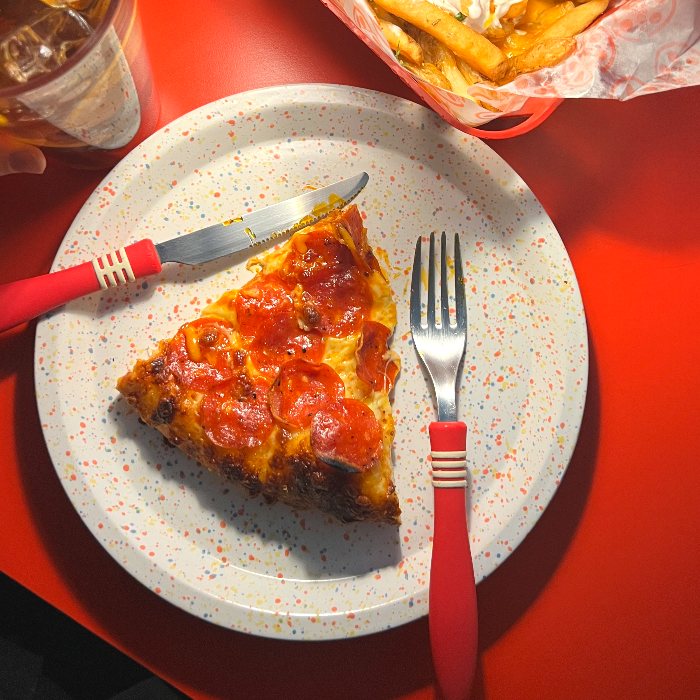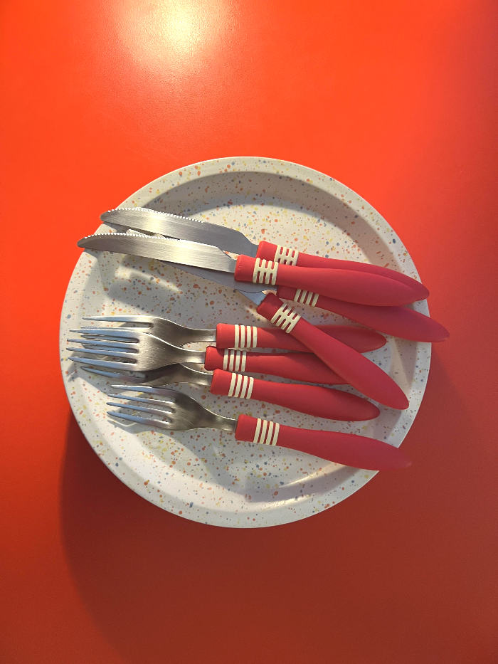 테이블이 레드컬러로 피자를 더욱 맛있어 보이게 만들어주는 거 같고, 포크부터 접시까지 아기자기하고 귀여웠어요.
