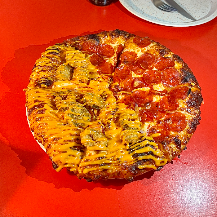 저는 페퍼로니와 핫치킨을 주문했고 도톰하고 토핑도 풍족하게 올라가 맛있어 보이게 나왔습니다.