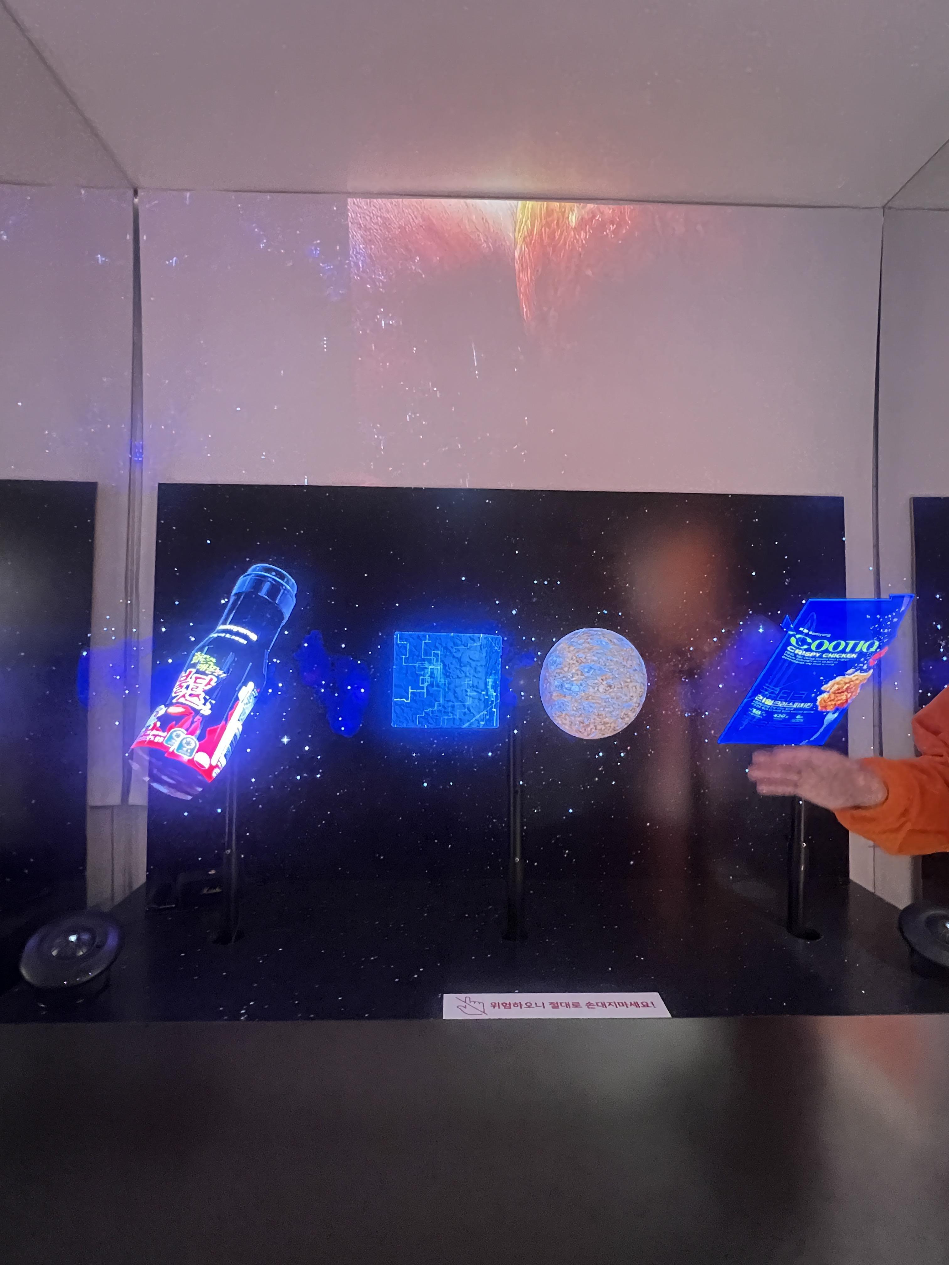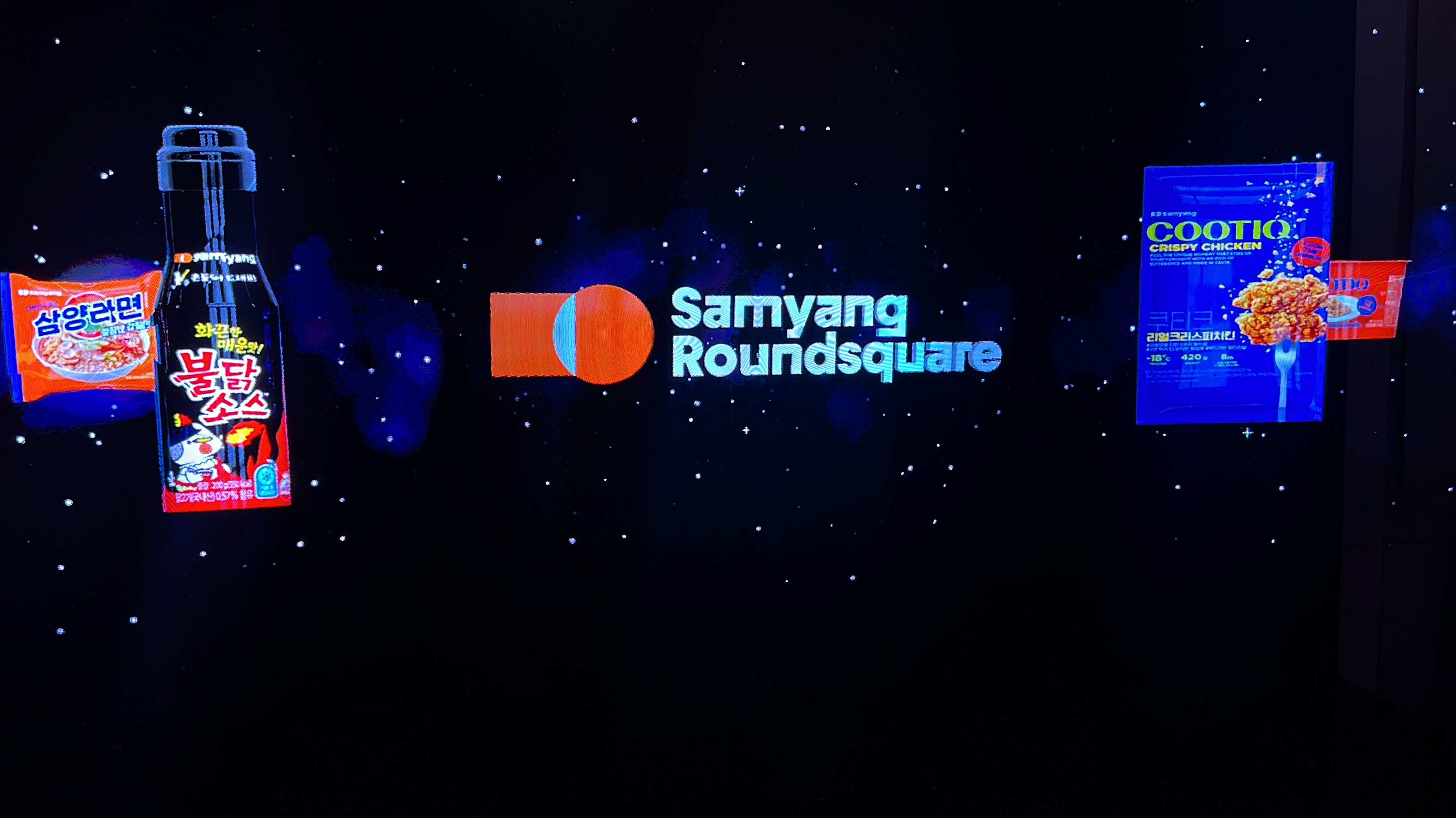 팬이 돌아가면서 삼양의 다양한 제품들이 영상으로 출력되는 거처럼 보이는데 음식과 과학이 함께하는 미래의 푸드테크의 모습을 상상할 수 있게 이해하기 쉽게 표현한 거 같아요.