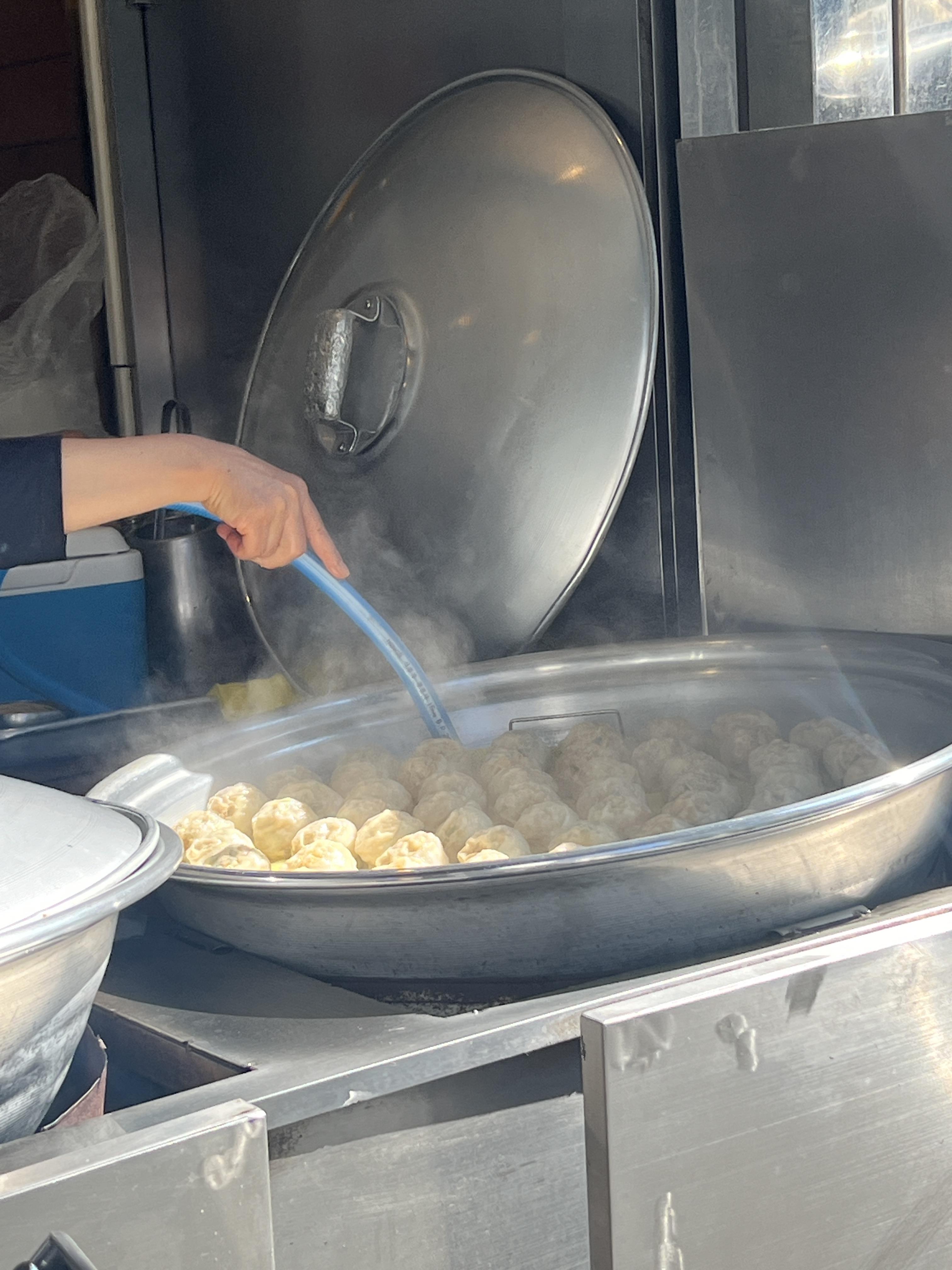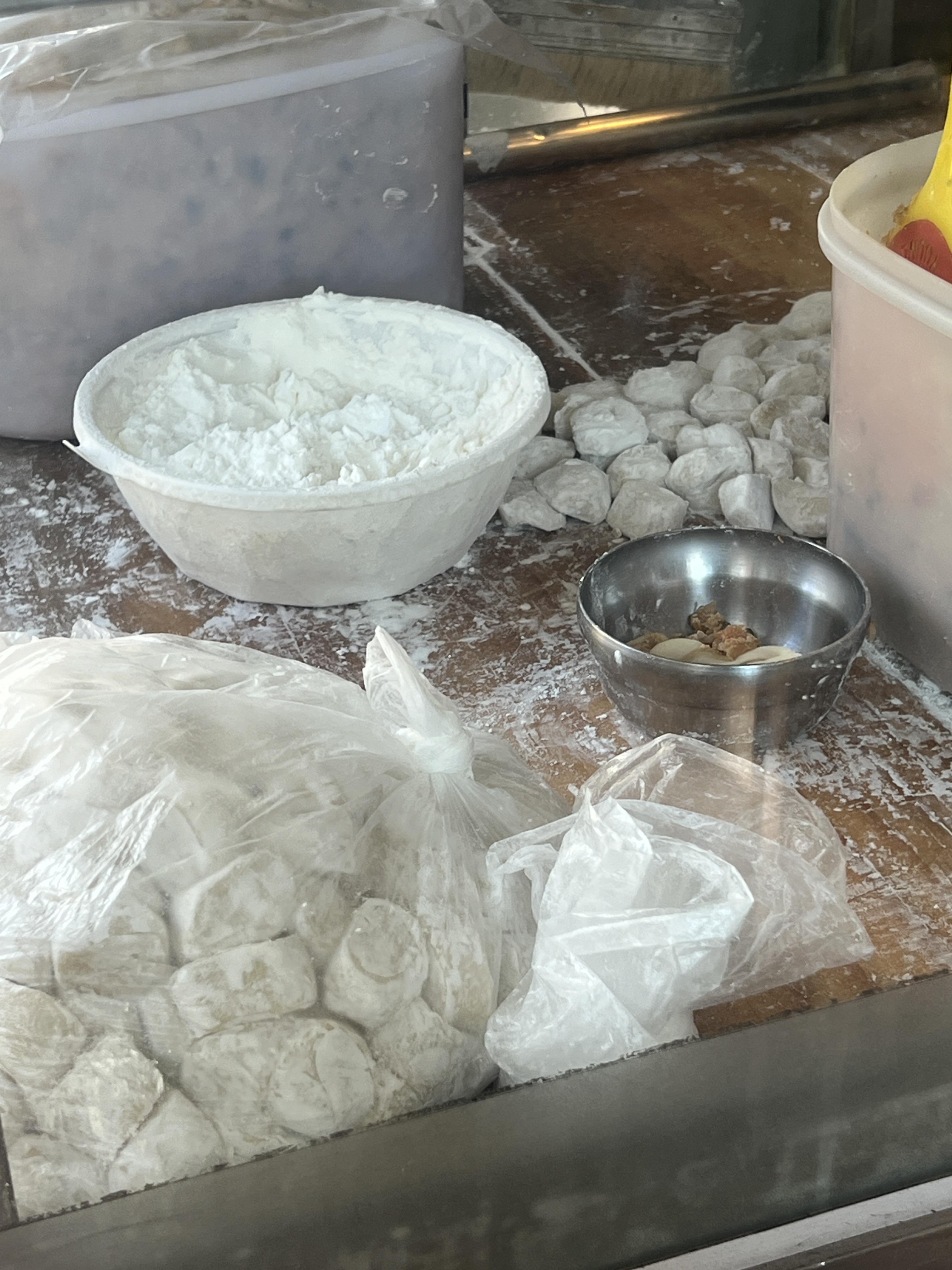 줄 서있으면서 우측에는 만두를 찌고 있고 좌측에는 직접 반죽한, 아직 펼쳐지지 못한 만두피 반죽과 만두소가 있었어요.