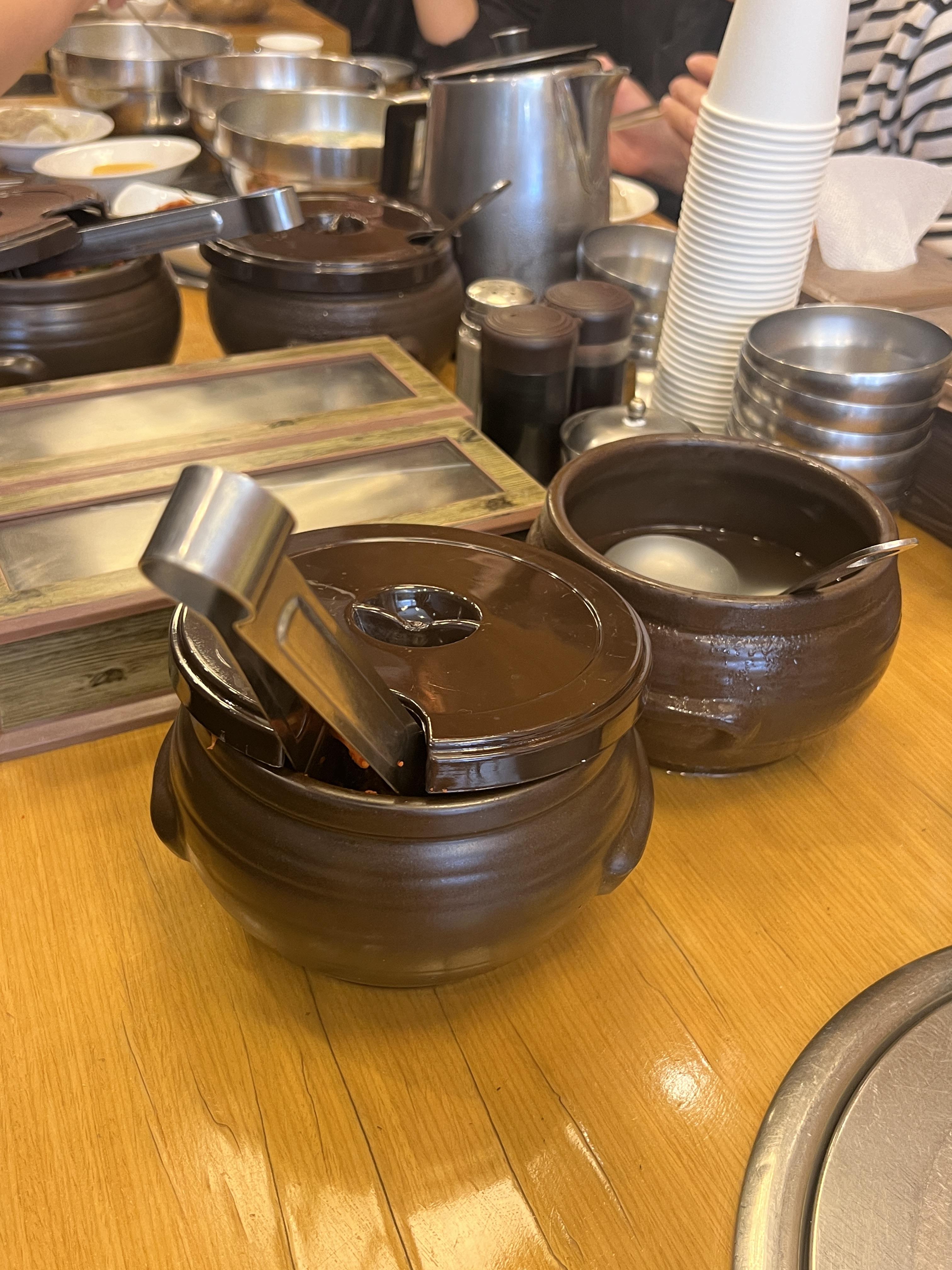 테이블에는 김치와 동치미를 덜어먹을 수 있게 준비되어 있었어요.