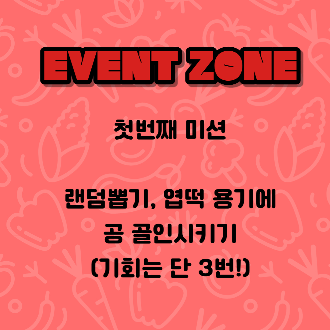 첫 번째 미션, 랜덤 뽑기! 엽떡 용기에 공 골인시키기 (기회는 3번)
