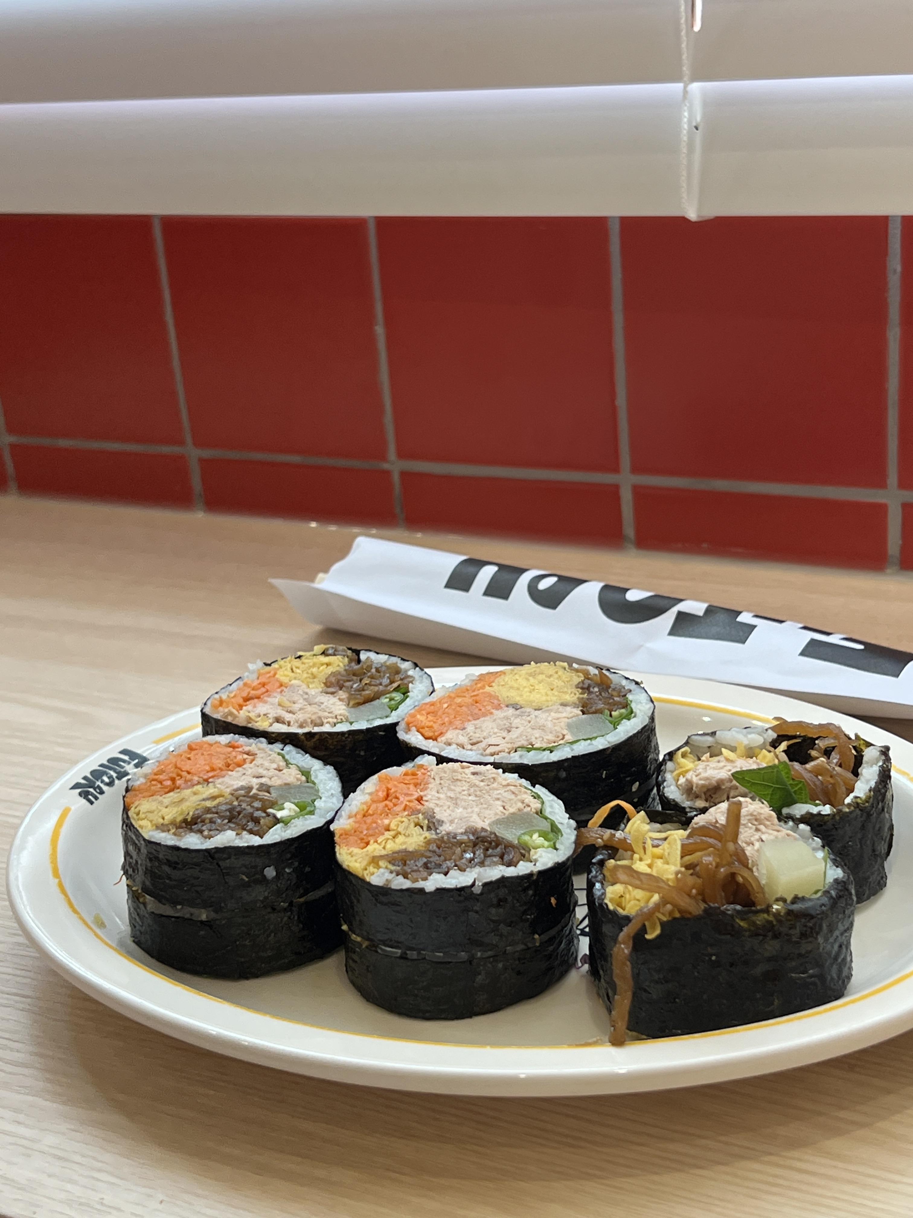 푸짐하고 이쁘게 담겨서 나오는 김밥과 빨간 타일의 인테리어가 음식을 더욱 맛있어 보이게 해 주고 전체적으로 밝고 따뜻한 느낌의 매장이다 보니 봄에 피크닉 가는 기분도 느낄 수 있던 거 같아요.
