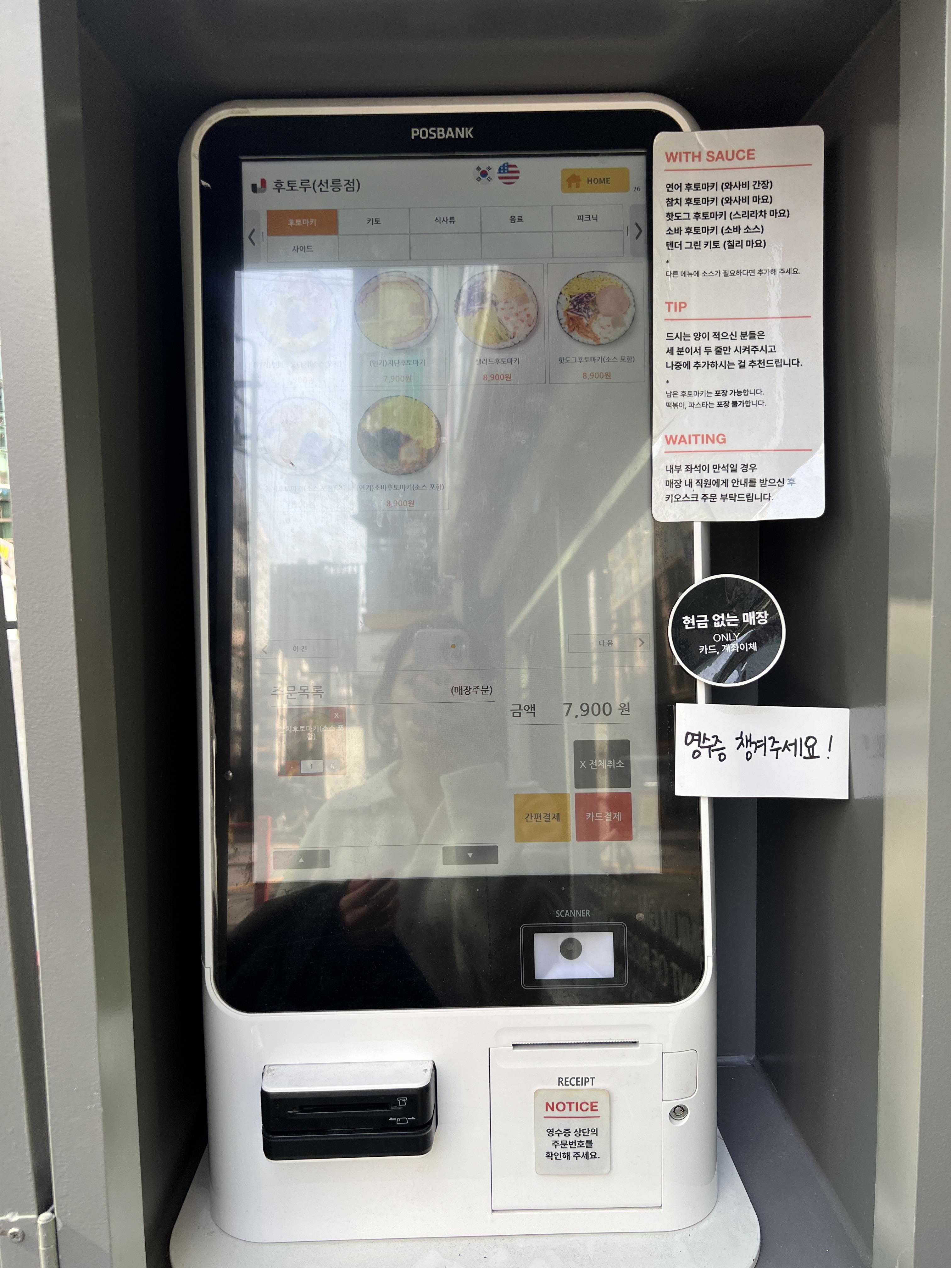 비대면 운영과 인력비를 아끼기 위한 키오스크가 문 입구에 있었어요.