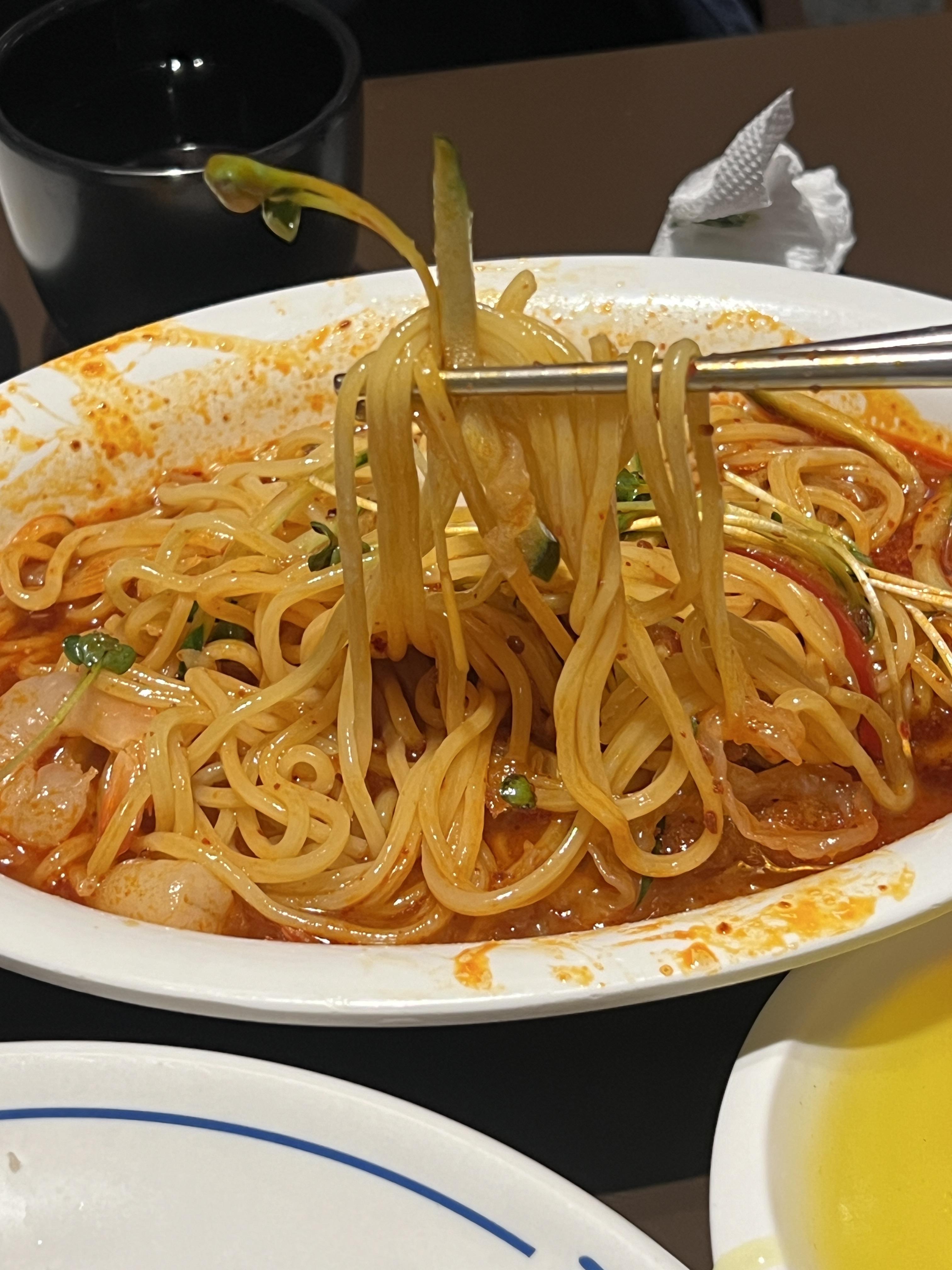 차가운 물탄 팔도비빔면 같기도 한데, 묘하게 중독성 있어서 계속 먹게 되는 매력이 있는 음식이었어요.