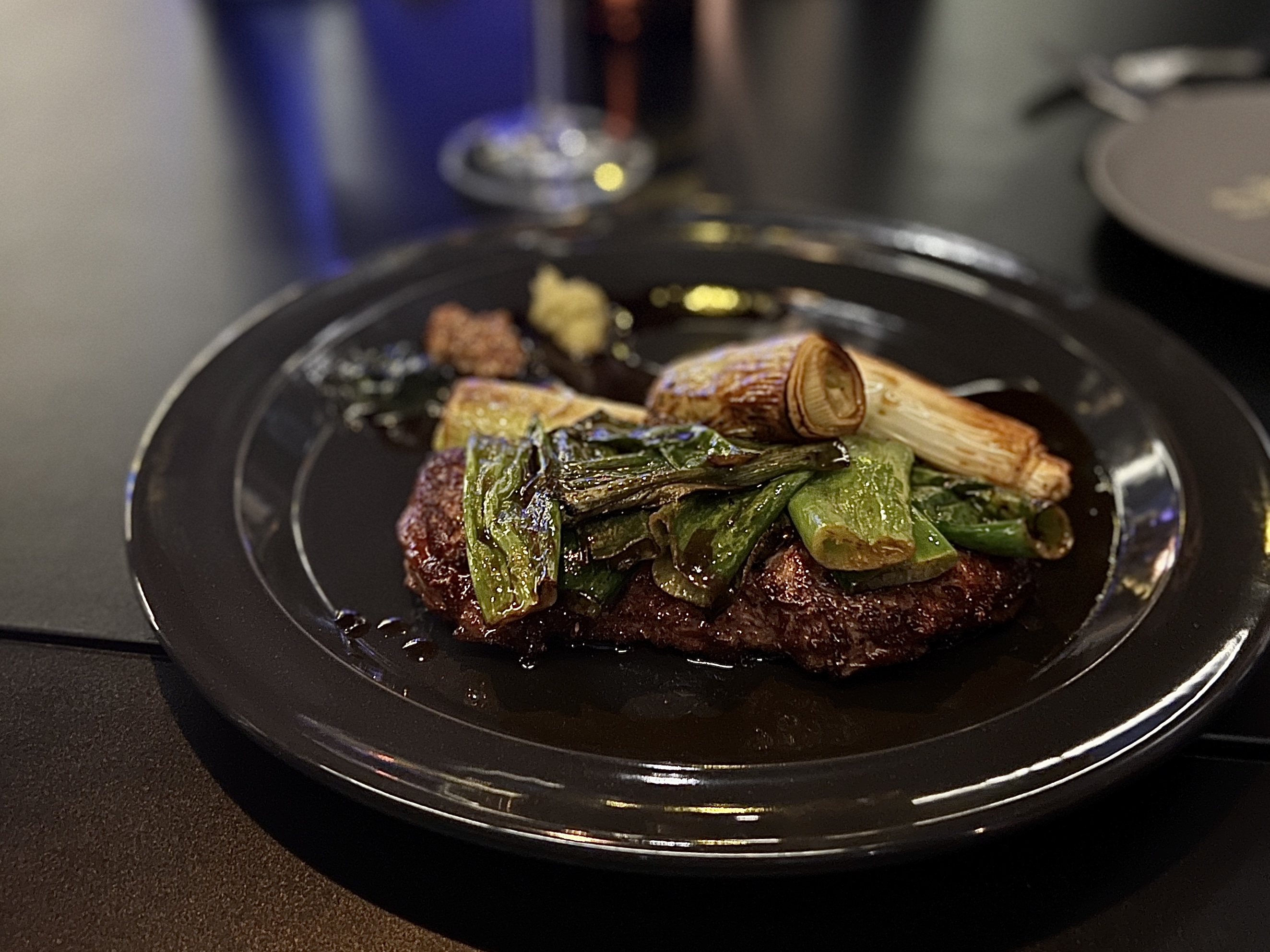 원하는 익힘의 고기에 구운대파를 올리니 구워짐으로 인해 달달해진 파가