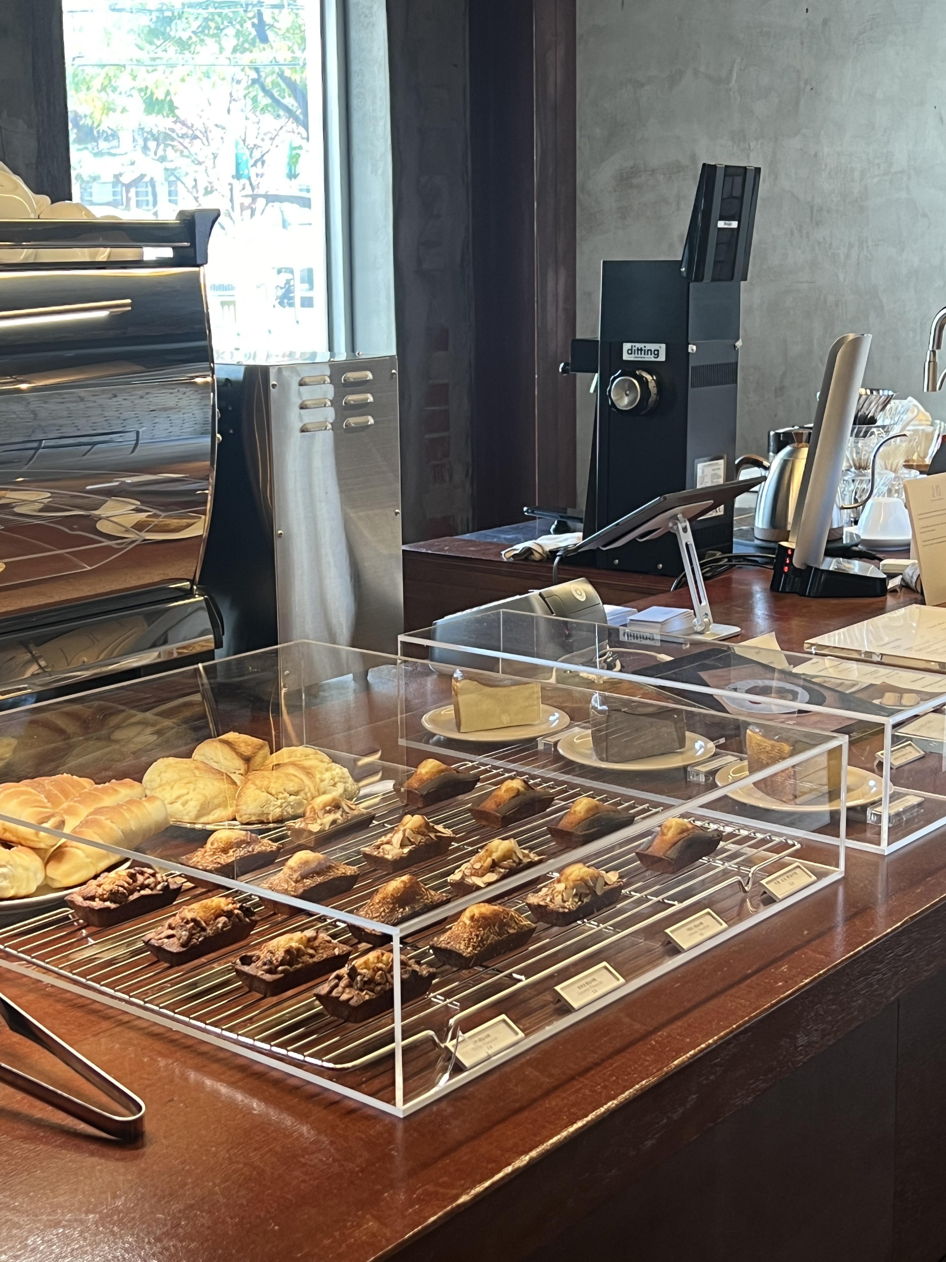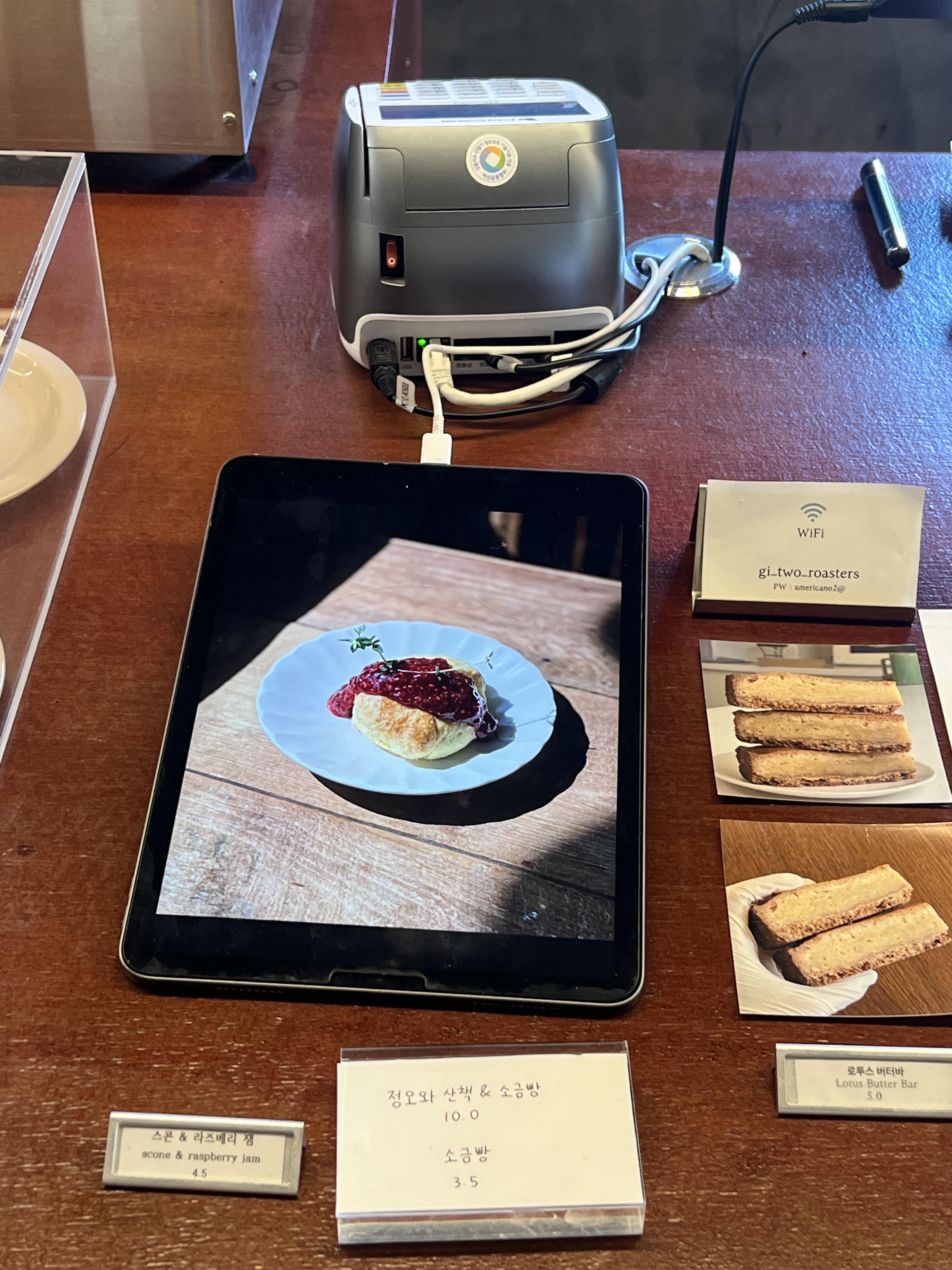 카운터 한쪽에는 스콘과 마들렌 그리고 빵들이 있었고 메뉴 사진은 태블릿으로만 구경 가능한 디저트 메뉴가 있는데