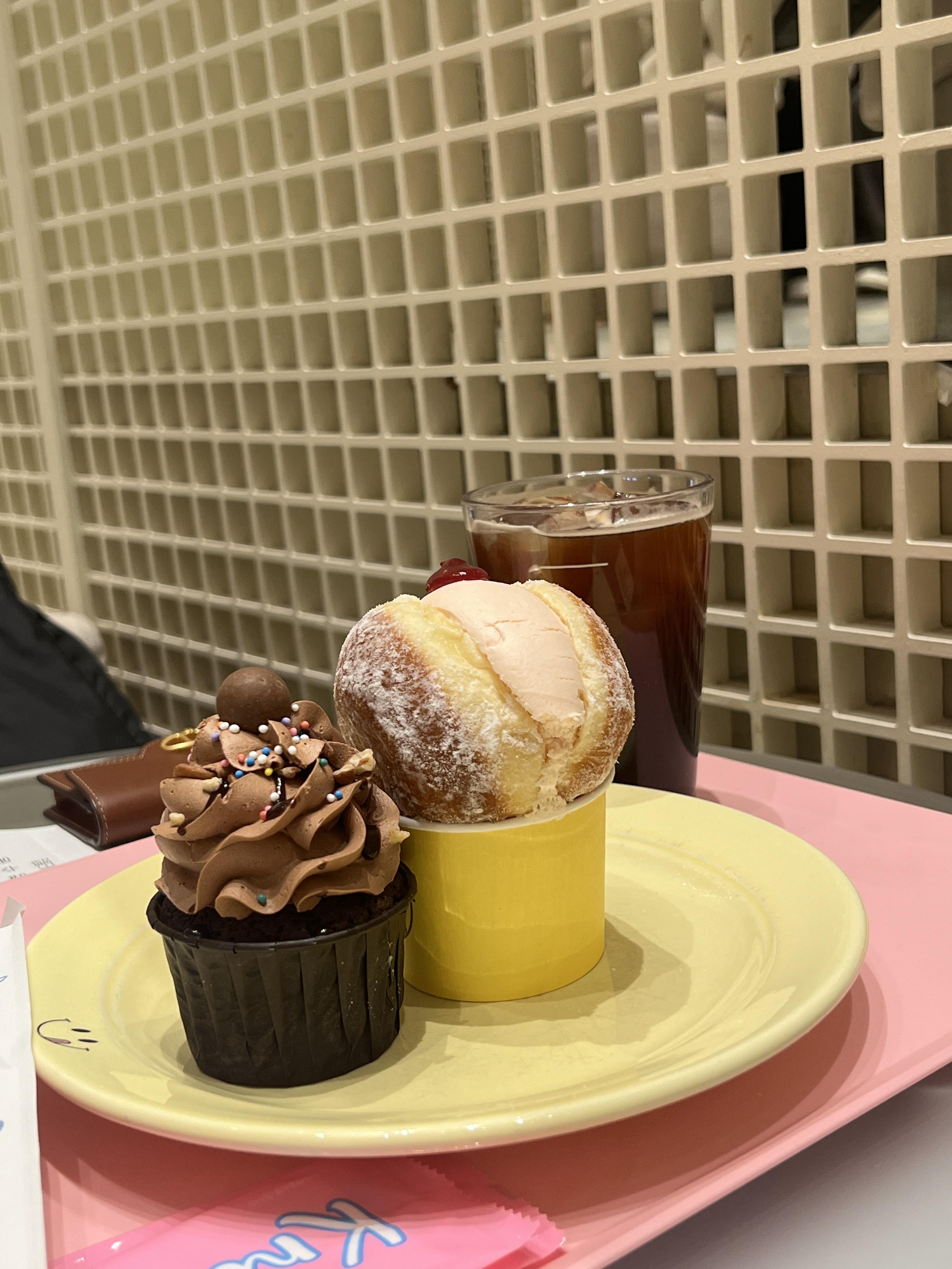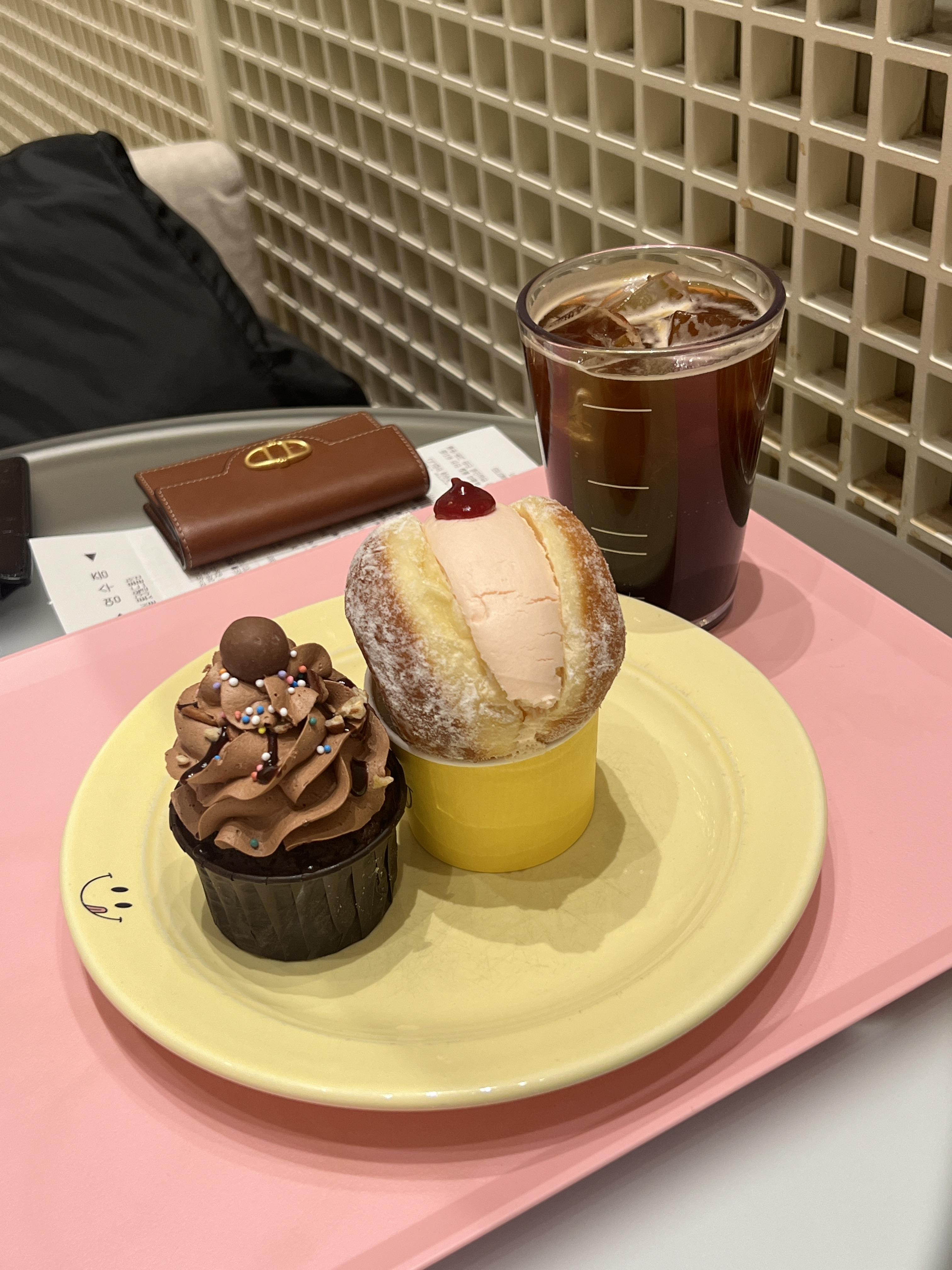 스트로베리 도넛과 초코 컵케이크 그리고 아이스아메리카노를 주문했습니다.