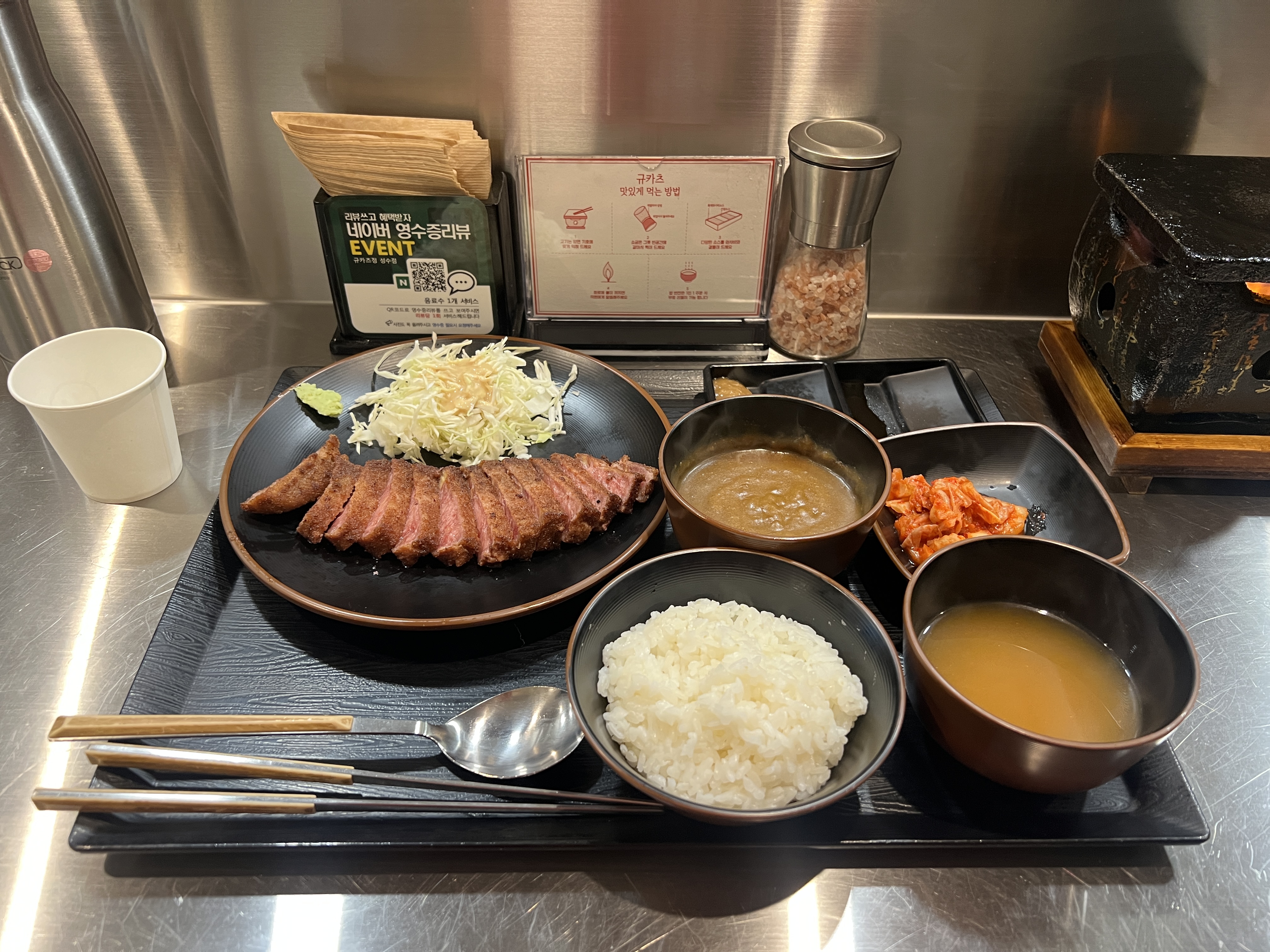 맛의 평가는 한마디로 완벽합니다. 규카츠는 겉은 바삭하면서도 속은 촉촉하고 부드러운 식감이 돋보이며, 고소한 소고기의 풍미가 입 안 가득 퍼집니다. 개인 화로에서 직접 구워 먹는 재미도 음식의 즐거움을 더해주며, 각종 소스와 와사비는 규카츠의 감칠맛을 한층 끌어올려줍니다. 밥은 고슬고슬하게 잘 지어져 있고, 미소된장국은 고소한 맛이 은은하게 배어 있어 규카츠와 잘 어울립니다. 샐러드는 상큼하면서도 신선해 기름진 고기 요리와의 균형을 잡아줍니다.