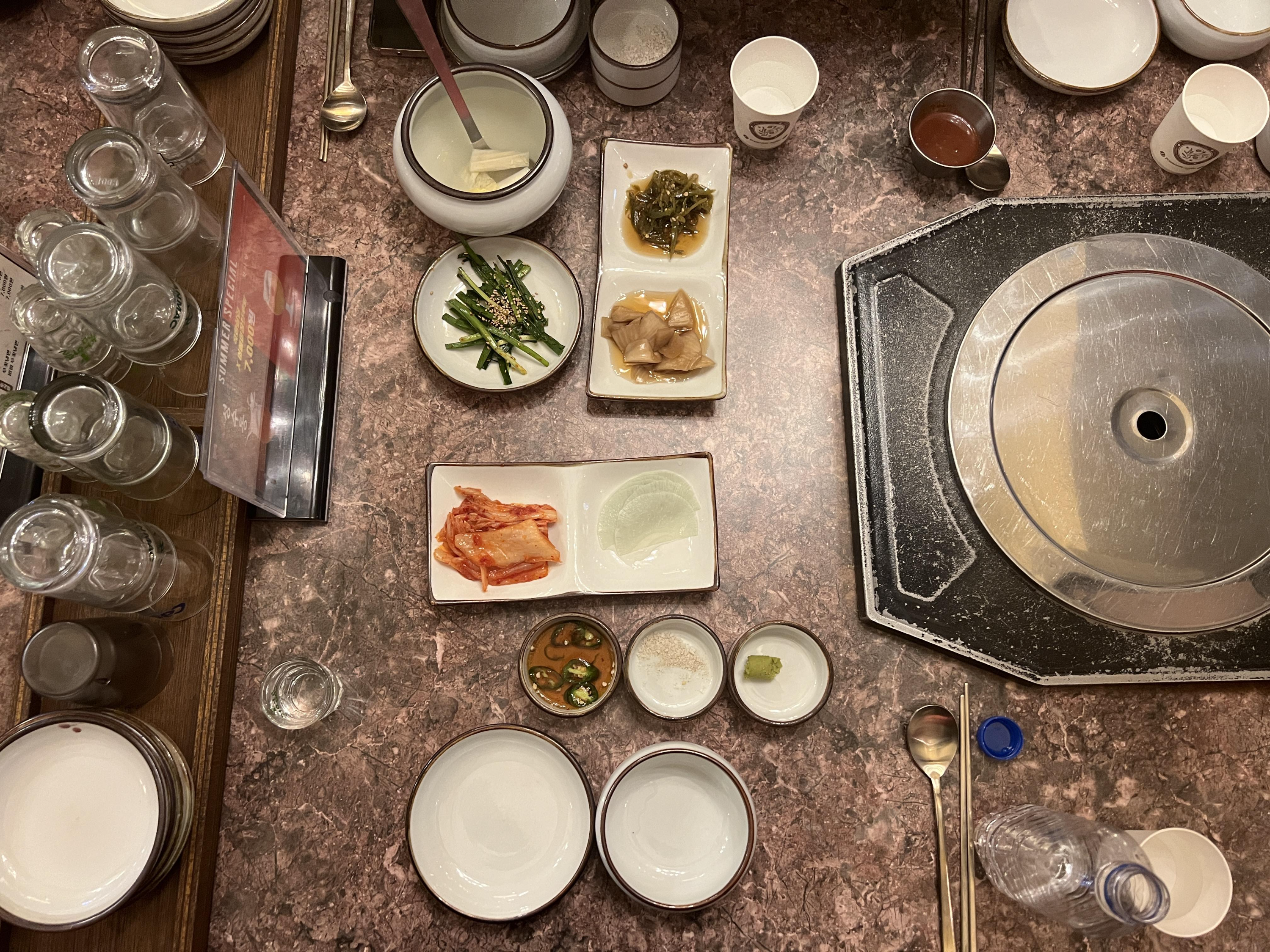 테이블도 매장분위기와 어울리고 찬들도 깔끔하게 나옵니다. 고기를 함께 찍어먹을 수 있는 와사비, 소금, 장과 김치와 쌈무 그리고 동치미까지 테이블에 세팅되어집니다.