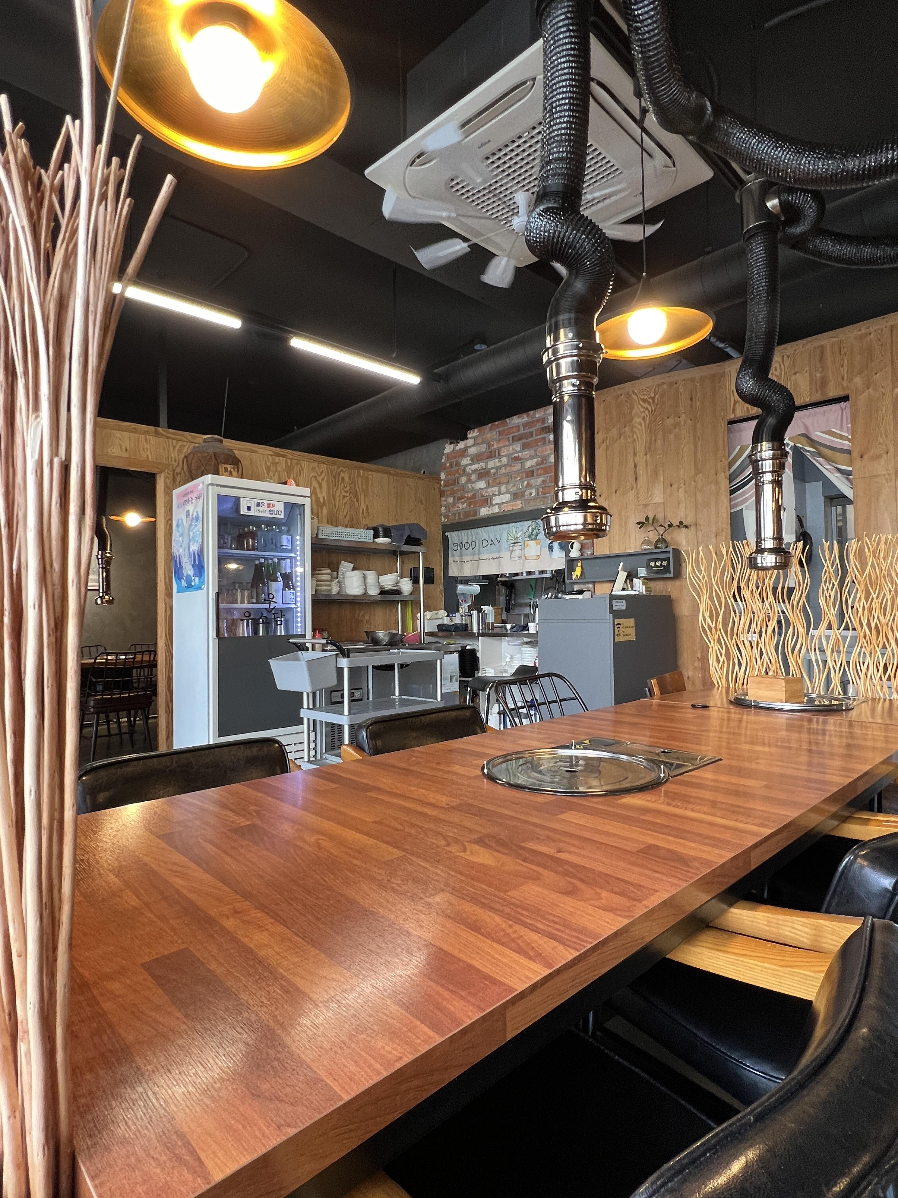 이곳은 모던하고 고급스러운 인테리어가 돋보이는 공간입니다. 시골에 위치한 한우집인데 내부가 이렇게 깔끔할 수 있구나 생각할 수 있게 만들어주는 반전 매력을 가진 매장입니다. 내부는 따뜻한 우드 톤과 은은한 조명으로 꾸며져 있으며, 좌석 간 간격이 넉넉해 프라이빗한 데이트를 즐기기에 좋습니다. 창가 자리에는 큰 유리창을 통해 자연광이 들어와 낮 시간에는 밝고 따뜻한 느낌을, 저녁에는 조명이 은은하게 분위기를 살려줍니다.