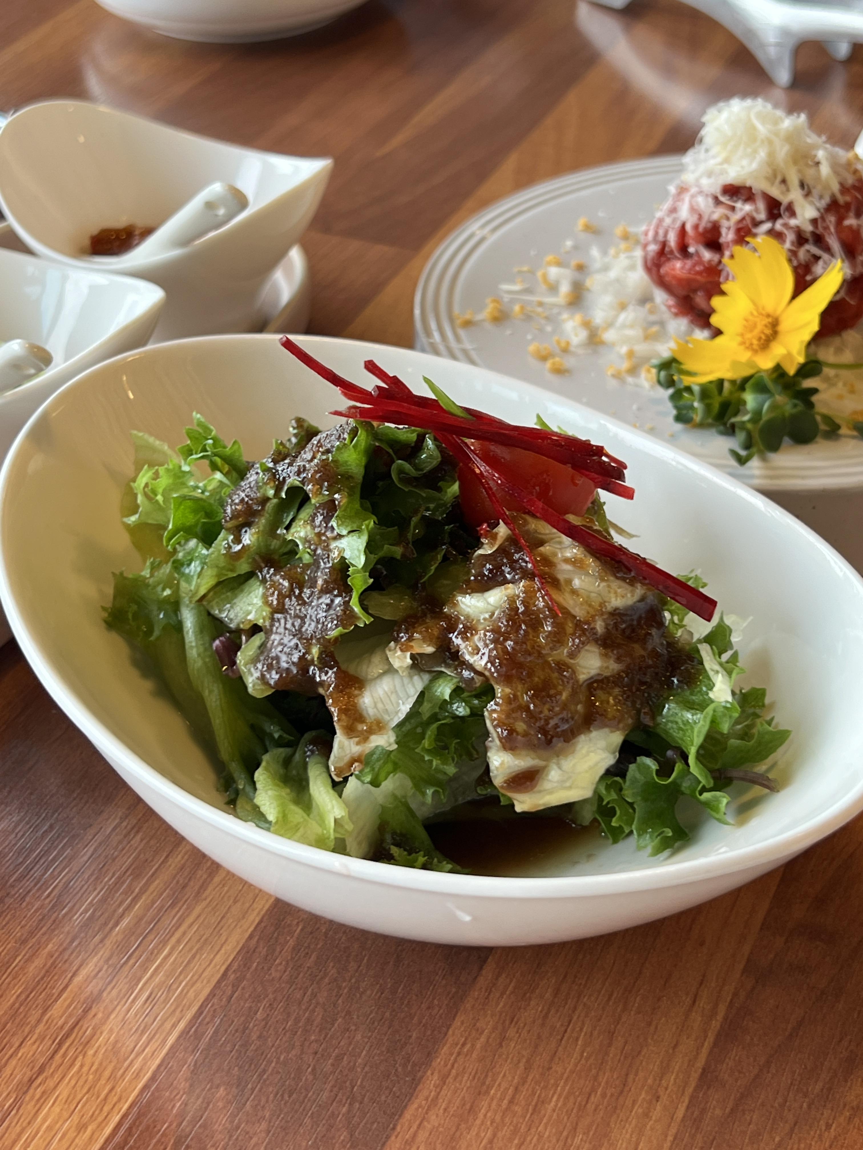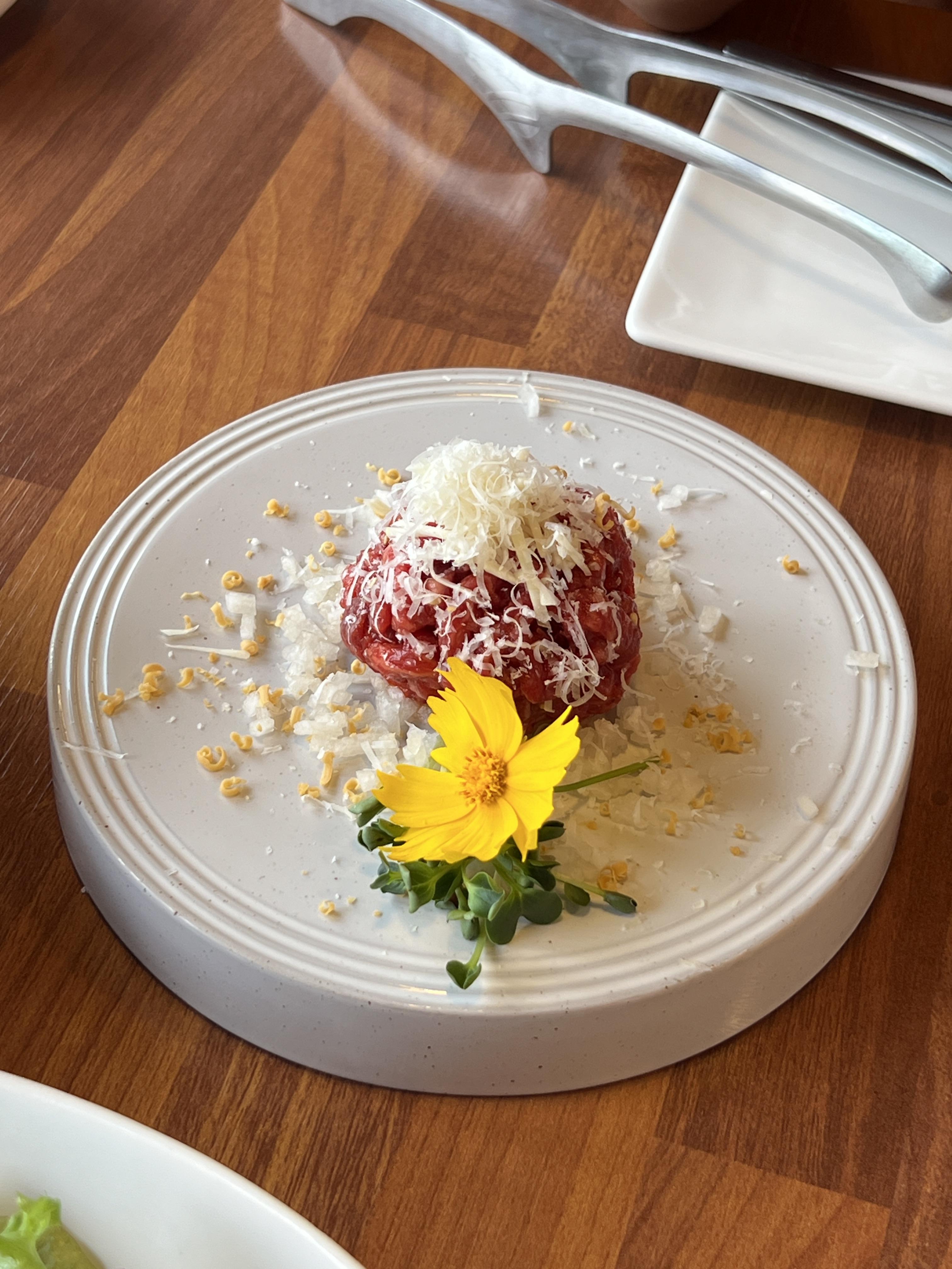 육회는 얇게 썰어진 배와 함께 플레이팅되어 마치 예술 작품처럼 정갈하게 담겨 나오며, 옆에 데코로 올려진 노란색 꽃이 육회를 더욱 신선하고 맛있어 보이게 만들어주고 담겨있는 접시마저도 다른 식당에서 평범하게 볼 수 있는 육회 접시가 아니어서  여자분들이 인증샷을 남기기에도 너무 좋은 비주얼이었어요.